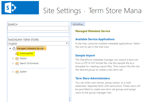 - This is the location new TermSets are created in when using the AutoClassifier management site.