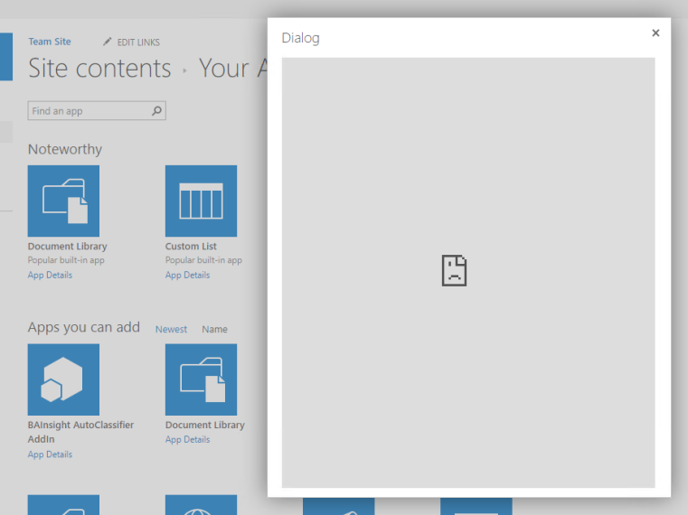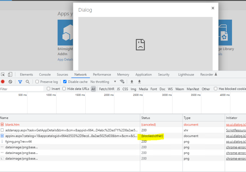 Note: The addanapp.aspx page succeeded successfully, but the appinv.aspx page which renders in an iFrame, has been blocked.