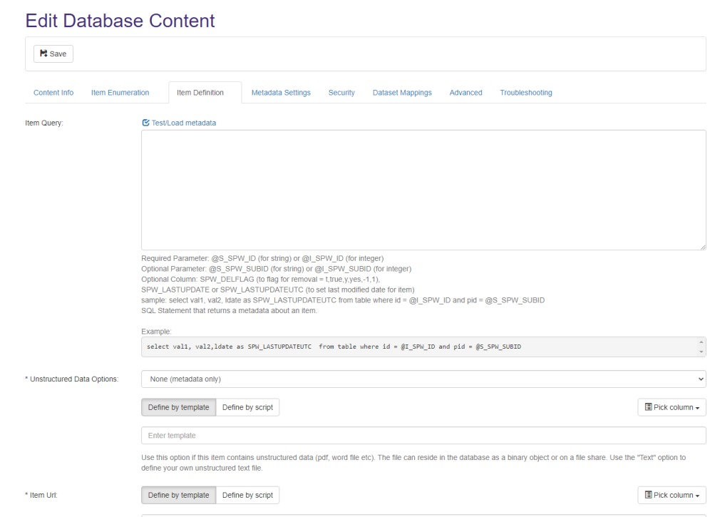 > Edit. - On the Edit Database content page that appears select Item Definition > Unstructured Data Options.