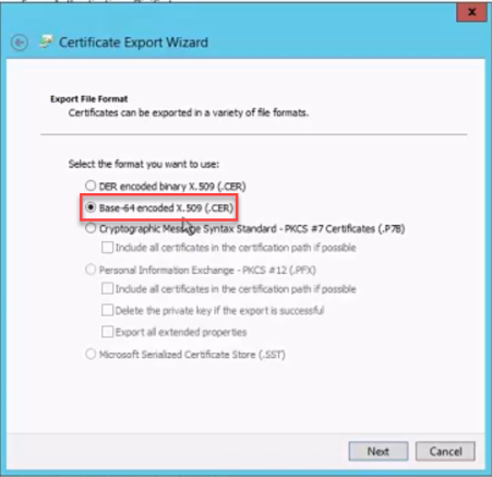 Also, when exporting your certificate using IIS, note that it MUST BE Base-64 encoded: