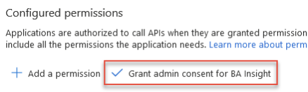 - In the Configured permissions menu, click the Grant admin consent button to grant the selected permissions (requires admin rights).