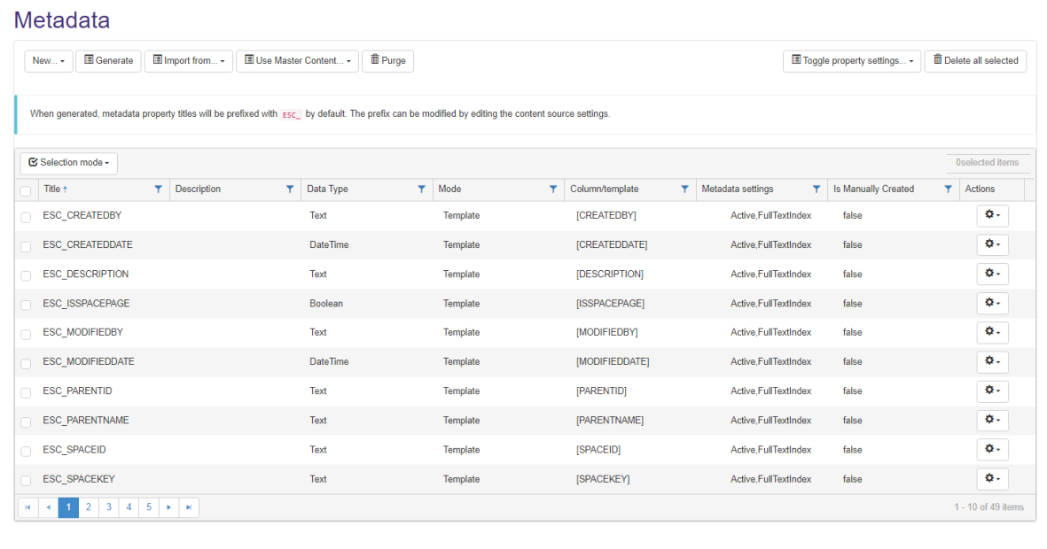The Content Metadata page enables you to manage existing metadata definitions for an established Content Source, create new metadata definitions, and clone existing metadata properties to new Content Sources.