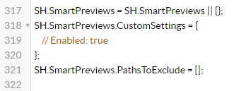 - Back in your Advanced settings tab paste the copied settings inside the section SH.SmartPreviews.CustomSettings and change them accordingly: