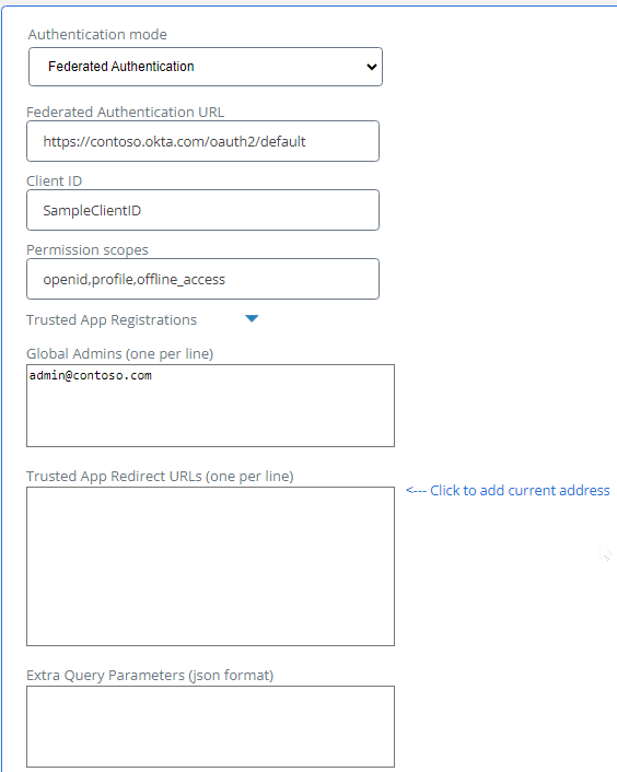 - URL of your Okta Authorization Server: the server configured with the UPN claim in the ID token for the open ID (or All) scope