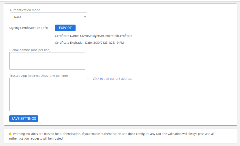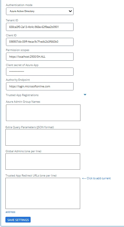 - Trusted App Redirect: Click the "<—Click to add current address" link on the page to enter your SmartHub site URL if it isn't currently there.