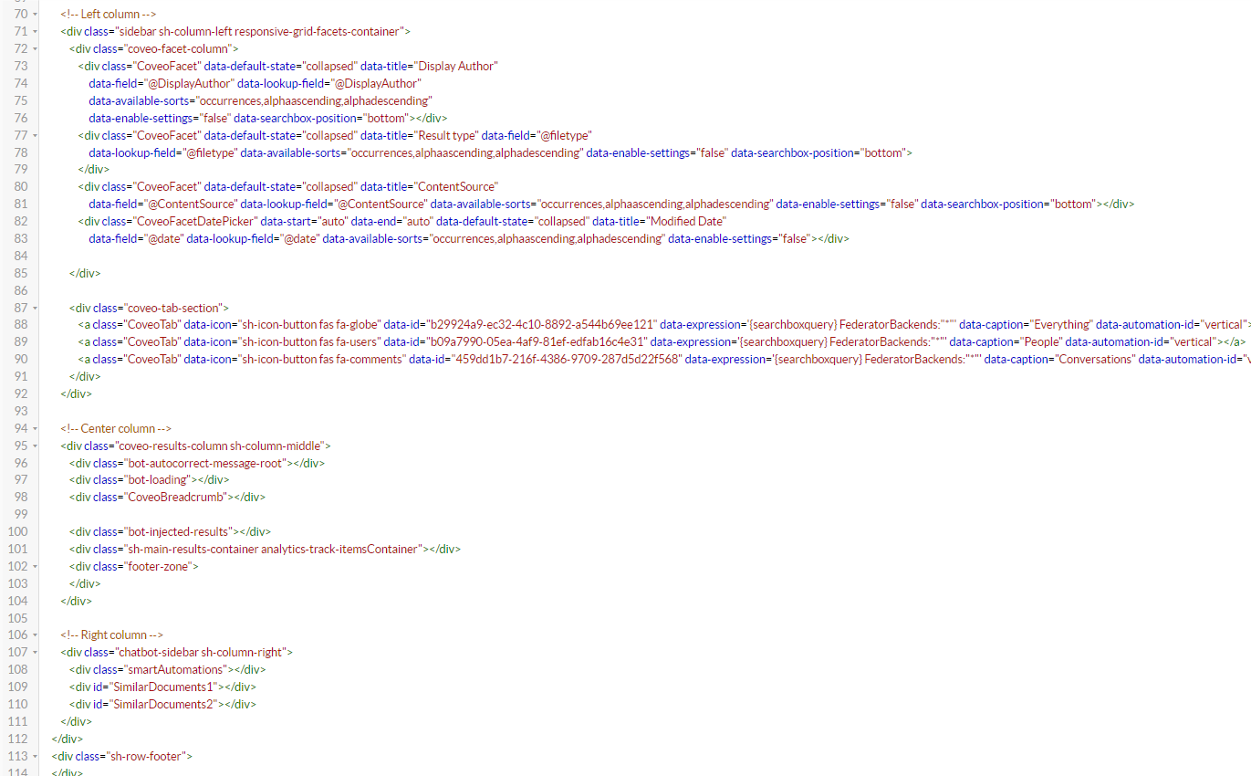 • In your Results HTML file (or your custom Results HTML file), the left column refiners are defined around line 70, under the text <!-- Left column -->.