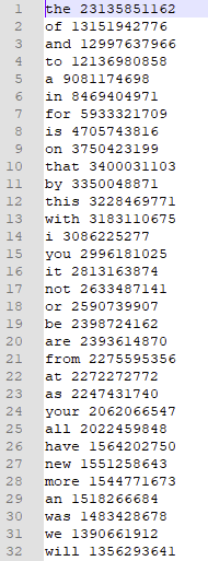 - Each line contains the term along with a number (between 1 and 9223372036854775807).