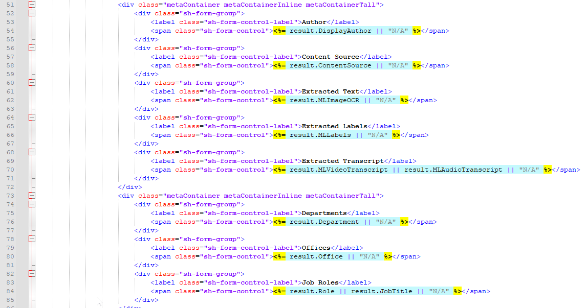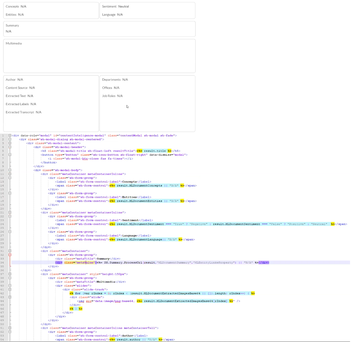 • Any fields in your modalTemplate.html file that are NOT included in the "data-fields-to-include" comma-separated list, are not populated with values in CI, even if the properties exist in your index.
