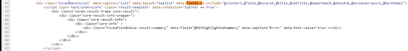• Class "CoveoResultList" which contains "data-fields-to-include,"