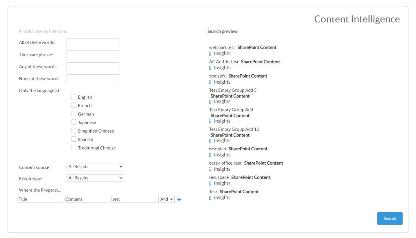 • A Content Intelligence "Insights" icon is displayed for each returned result.