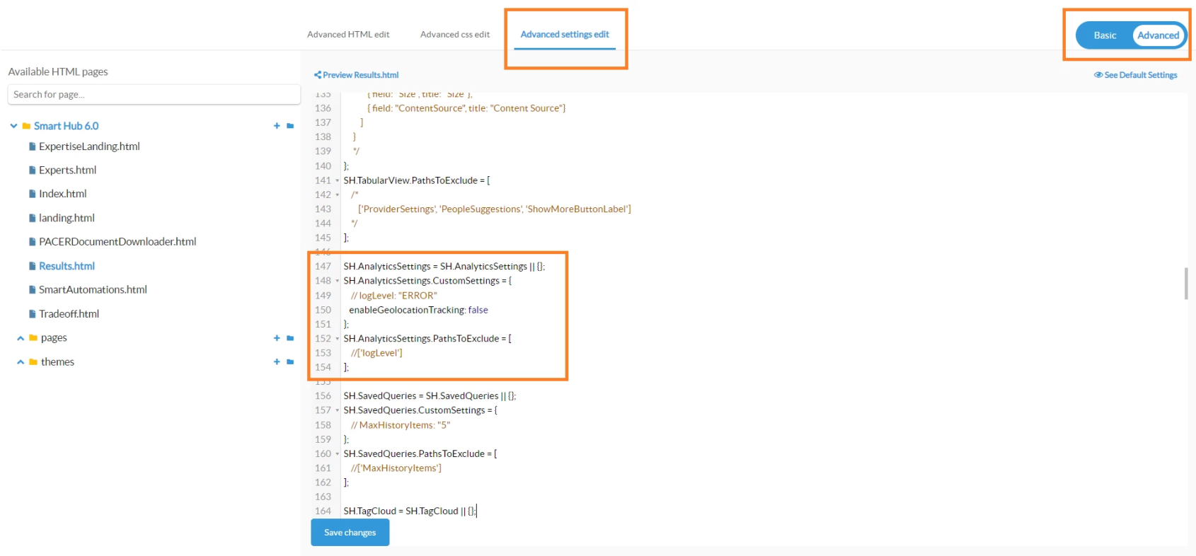 Note: When clicking on the See Default Settings button from the upper right corner, a new tab opens that displays all the default settings for the SmartHub modules.Locate the analytics settings section to see the default values that are used to control how analytics behaves on your web page.
