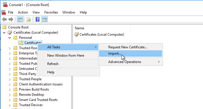 3. Right-click the Certificates folder under Personal. Select All Tasks then Import.