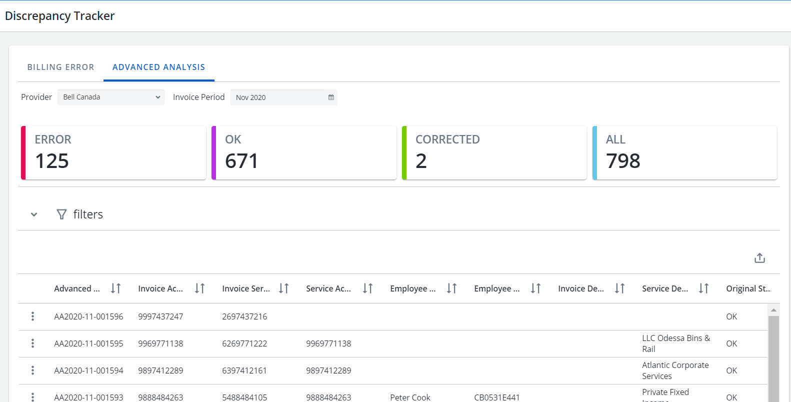 The Advanced Analysis feature of the Discrepancy Tracker was designed to simplify processes by allowing you update inventory and correct errors right from the Discrepancy Tracker. Advanced Analysis compares current Cimpl inventory data with provider invoices to make sure all services, accounts and charges align properly . This provides an immediate analysis of any errors in Cimpl which helps you determine the cause and solution to any issue. By using Advanced Analysis you can ensure that your inventory, services, and accounts are up to date and accurate.