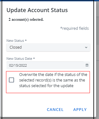 - Select Change Status. Update Account Status pop-up opens.
