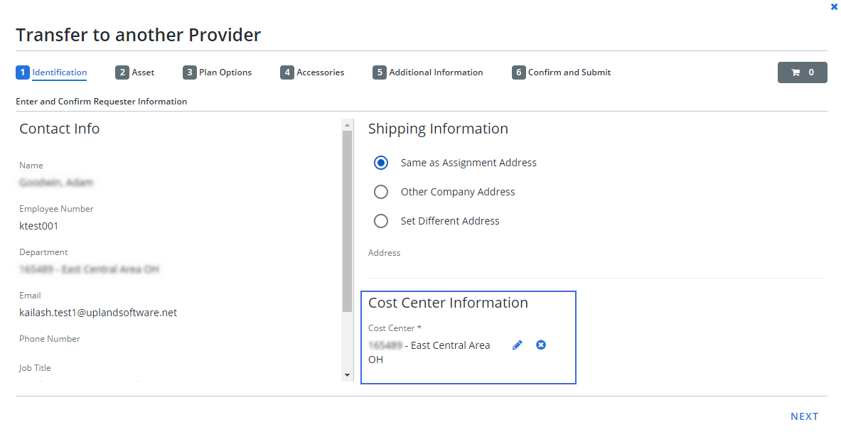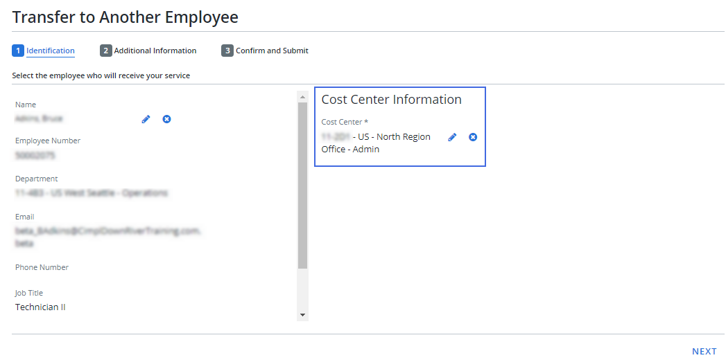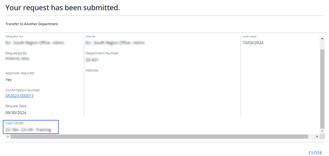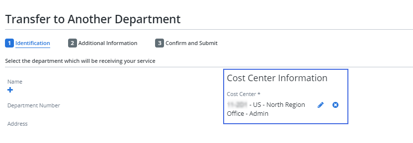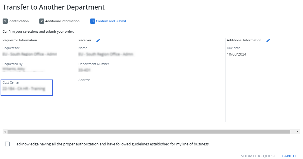 Cost center information is now displayed on both the request confirmation and request submission screens.