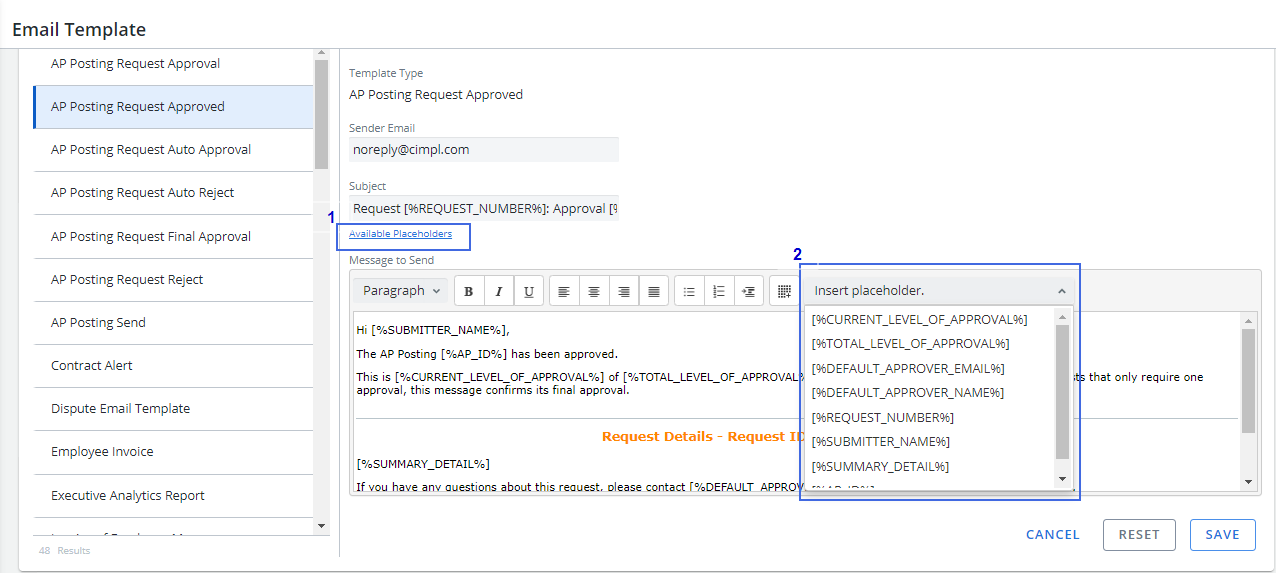 The following placeholder functionality has been added for email templates: