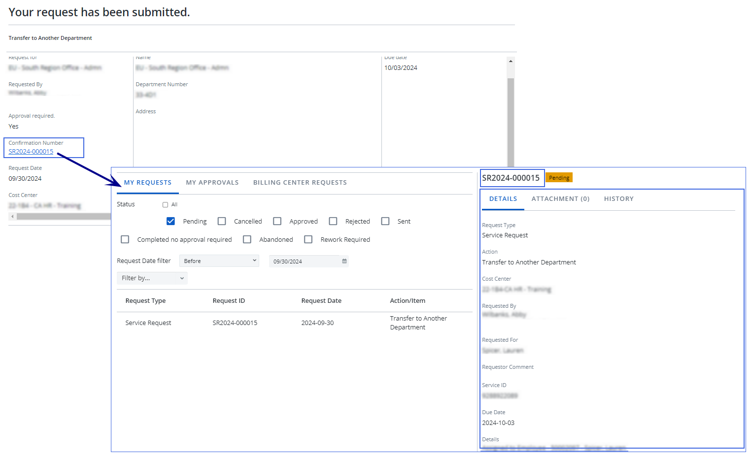 The confirmation number on the request submission screen is now linked to the My Requests tab.