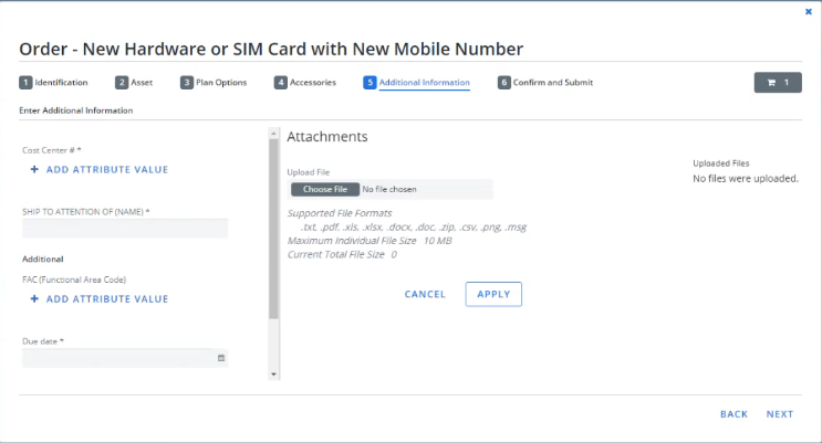 You can now add a file to a new request or upgrade. The file is attached to the request in the Request Center and the workorder.