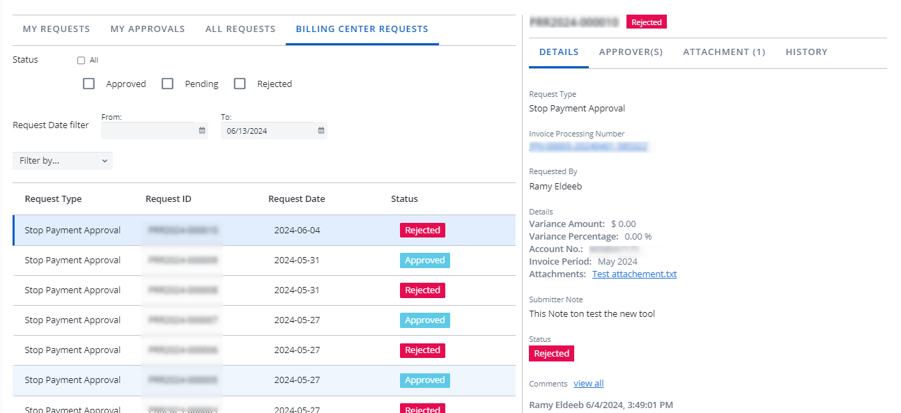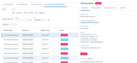 The Billing Center Request tab has been added, allowing you to approve or reject Stop Payment Approval requests.