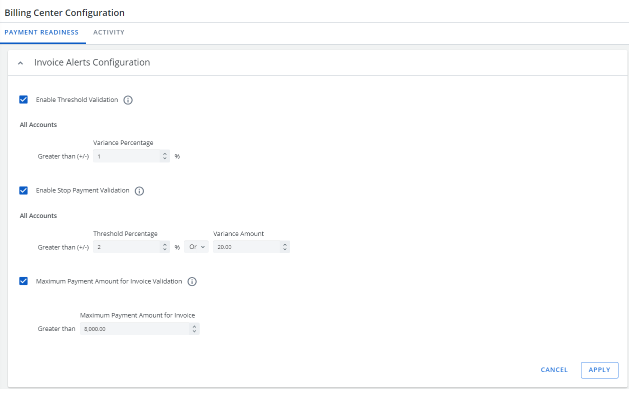 The new Billing Center Configuration tab has been added to allow you to configure thresholds, warnings, and maximum payment amounts for your stop payments. All changes are added to the log on the Activity tab.