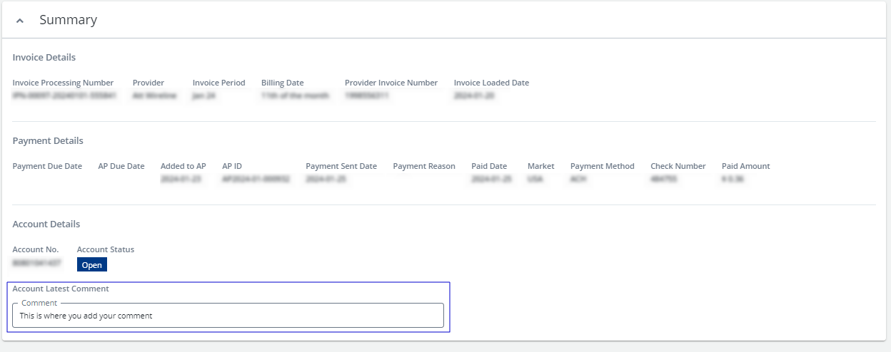 The Summary card now includes the Account Latest Comment field that shows the most recent comment added in the account's Comments section.