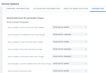 Email preferences for workorder actions: We have added options for configuring notifications when changing the status of a workorder. You can choose to notify the requestor, the workorder owner, both, or neither.