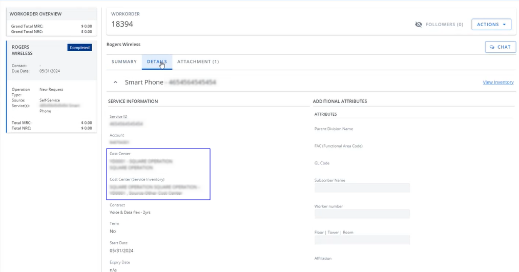The cost center from both the workorder and the inventory have been added to the Details tab.