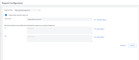 Click Recipient next to the CC box and type the email address(es) for the recipients to be notified when Stop Payment requests are created and approved.