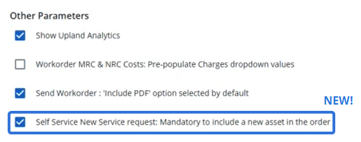 Administrators can now make it mandatory for users to include a new asset while requesting a new service. On the Configuration Management page, the Parameters tab now features a "Self Service New Service request: Mandatory to include a new asset in the order" checkbox.