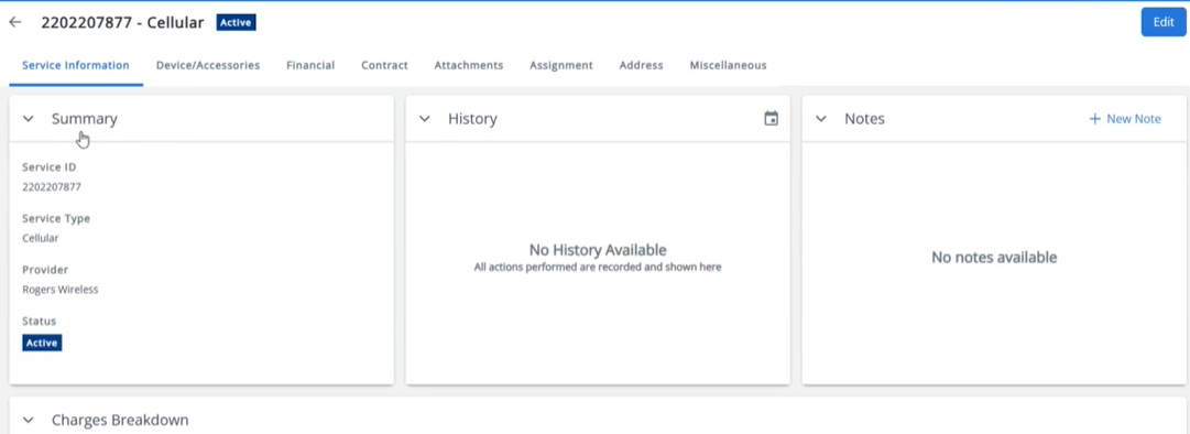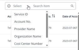This new page features a quick search bar in the top right-hand corner, allowing users to search through the asset inventory by one of six attributes: Service ID, Account No., Provider Name, Organization Name, Cost Center Number, or Hardware Name.