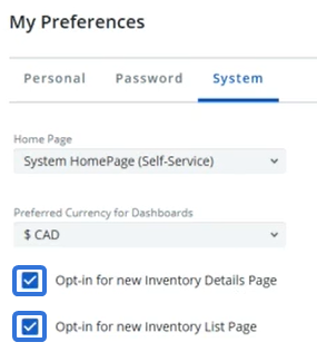 To enable the page, users will need to select the new Opt-in for new Inventory Details page and Opt-in for new Inventory List page checkboxes from their My Preferences page under the System tab.