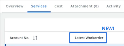 Administrators can now easily access the most recent workorder for each Service listed on one of the Accounts pages. After selecting one of the accounts and then selecting the Services tab, users will see a new "Last Workorder" column.