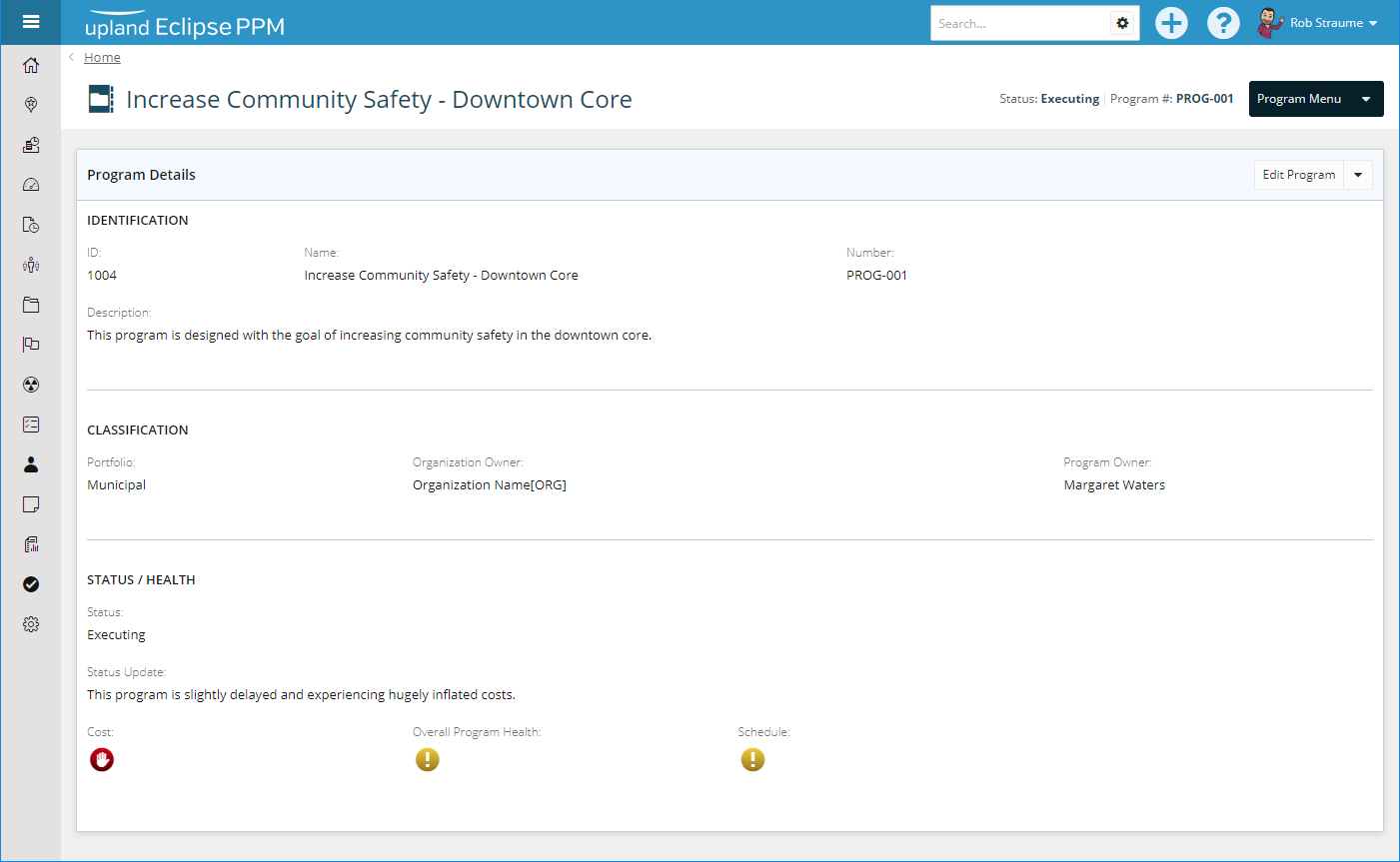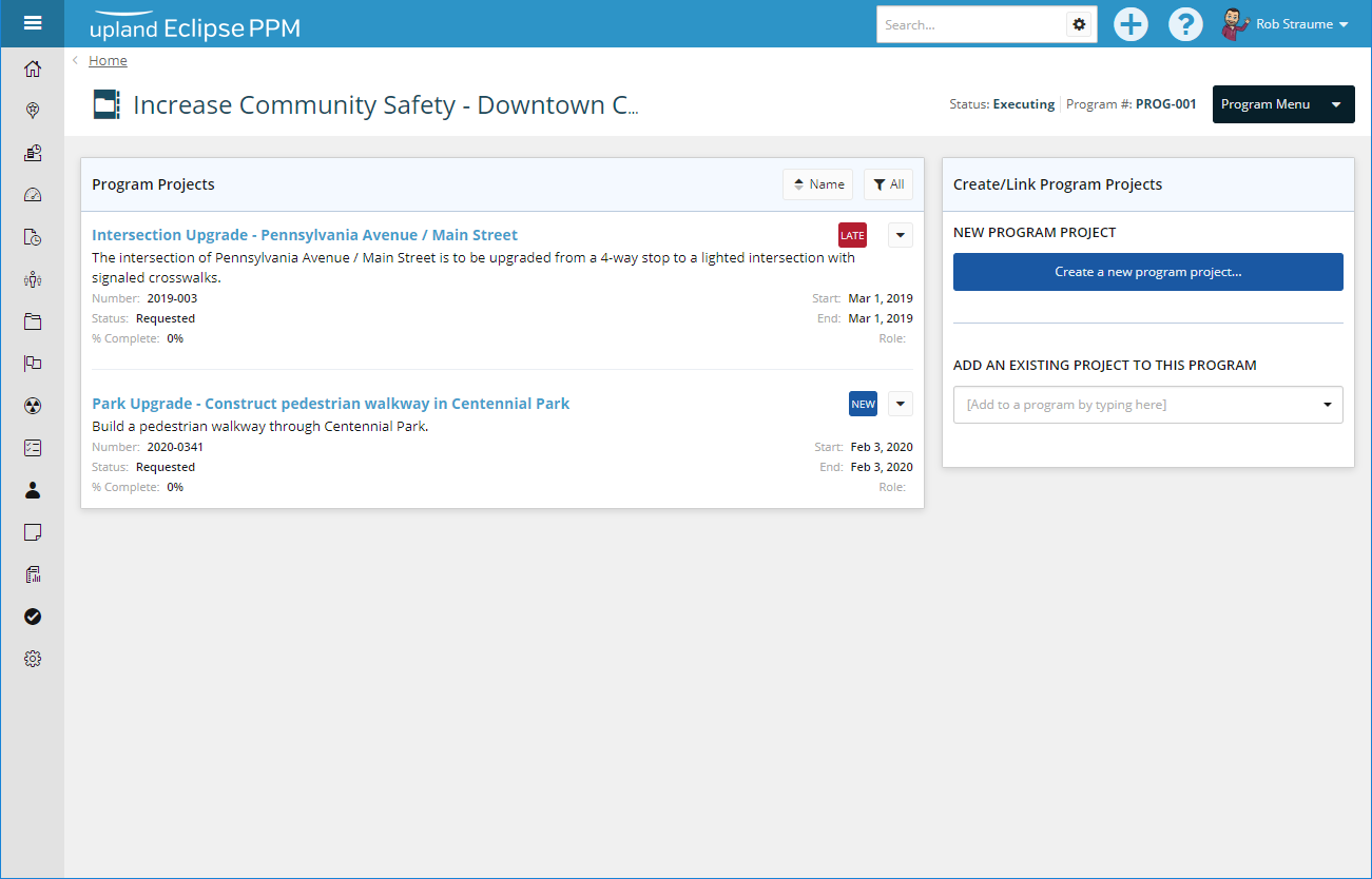 Organizations are now able to track programs inside Eclipse. A program is a collection of projects designed to drive the organization towards achieving a strategic goal. The projects may span many departments/teams/group/silos, but when reviewed as a whole they facilitate change within the organization. Each project inside a program provides a specific measurable output that can be used to help interpret the success of a program. Inside a program, some pieces of the component projects can be managed as a group in hopes of achieving a better outcome than by managing each project individually. A program IS NOT "just a big project".