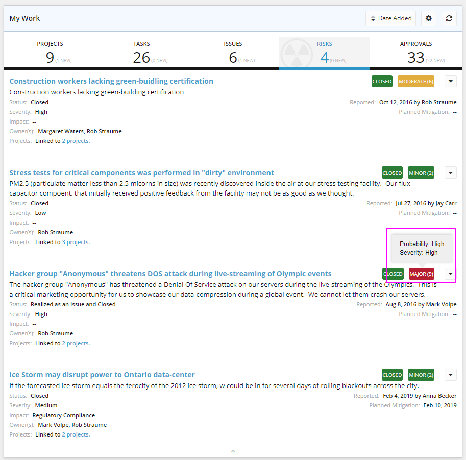 Risk Managers will notice a new field throughout the application called "Risk Score" which ranks risks as "Minor", "Moderate" or "Major" based on risk probability and risk severity. The score of a risk is calculated by multiplying the "Risk Probability Sort Order" (How likely is this risk to occur?) and "Risk Severity Sort Order" (How bad is this risk?).