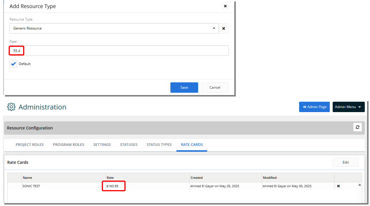 An issue caused an error when editing or saving a Resource Type that included a Rate containing decimal values. The error occurred both when assigning a Resource Type with Default Rate containing a decimal value and when updating the Rate Card information directly under Administration > Resource > Rate Cards, due to improper handling of decimal inputs in the Rate validation process.