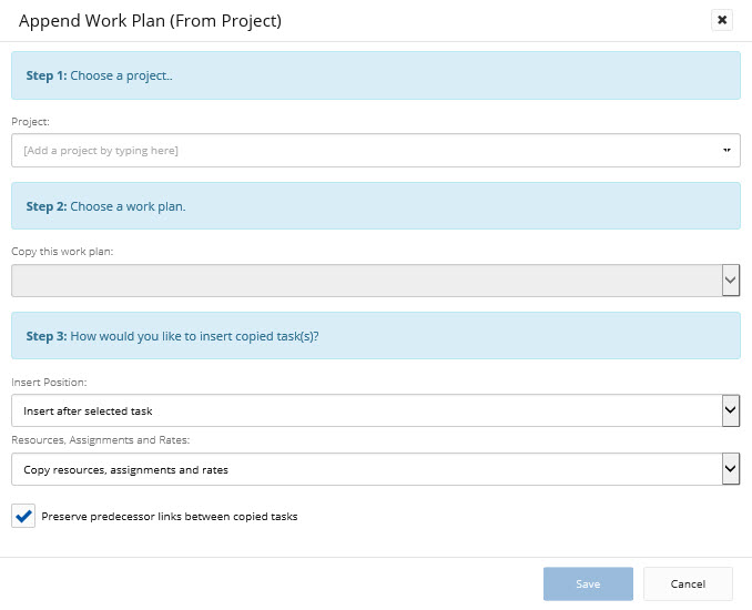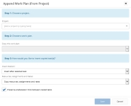 - In the Project field, type the name of the project, or part of it, from which you want to append a work plan.