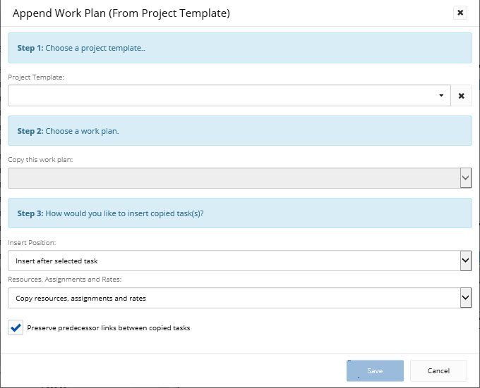 - In the Project Template field, type the name of the project template, or part of it, from which you want to append a work plan.