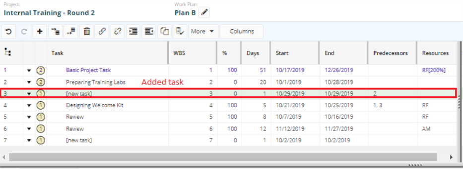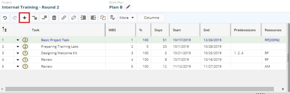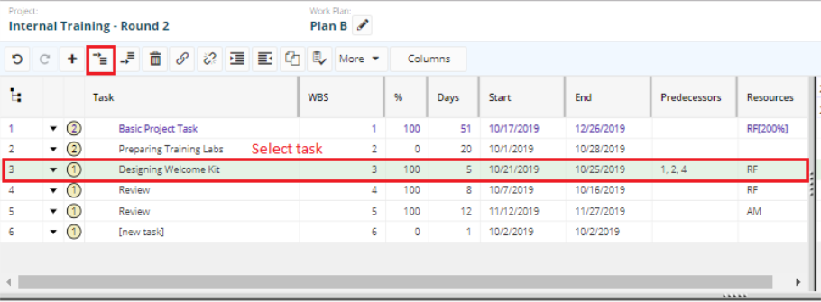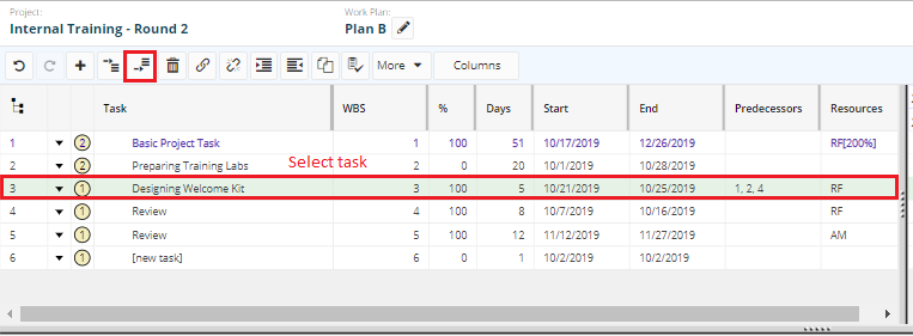 - At the top of the grid, from the actions bar, click the Insert Task Before icon