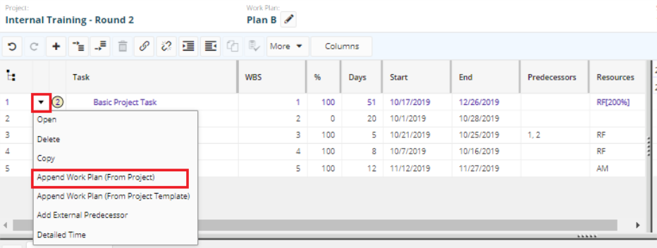 - From the drop-down menu, click Append Work Plan (From Project Template).