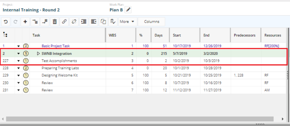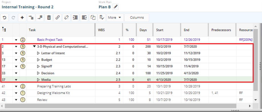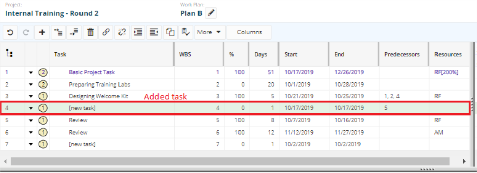 Note: Tasks appear on the same indent level as that of the task after/before which they are appended. Modifications may be required after you append other work plans depending on your project work plan.