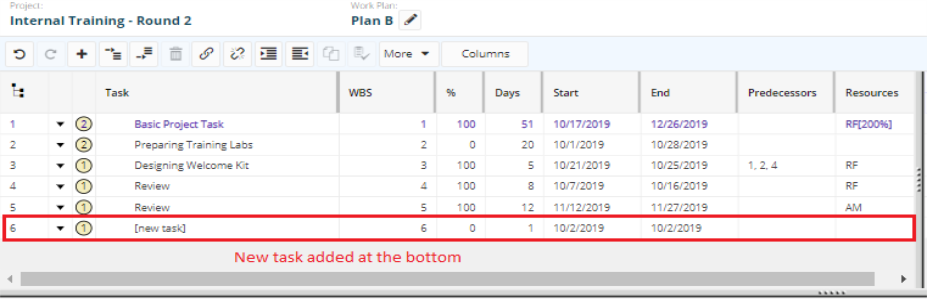 Note: Tasks appear on the same indent level as that of the task after which they are inserted.