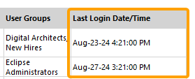Additionally, the column furthest to the right will display the date and time that each listed user last logged into Eclipse PPM.