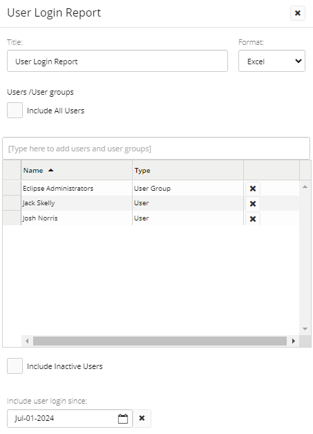 Include user login since: Select this field to filter the users by the date they logged into Eclipse PPM. Any users who logged in before the selected date will not be included in the report.