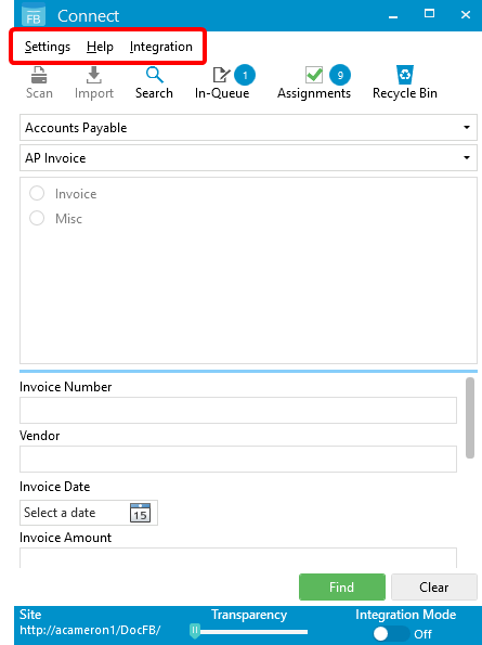 Integrations: The option available in this menu allows a FileBound System Administrator to set up integrations with Connect. See Connect integrations for more information.