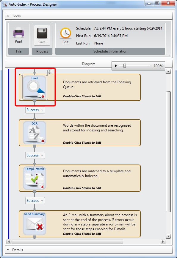 - Double-click the Find stencil within the Process Designer window.