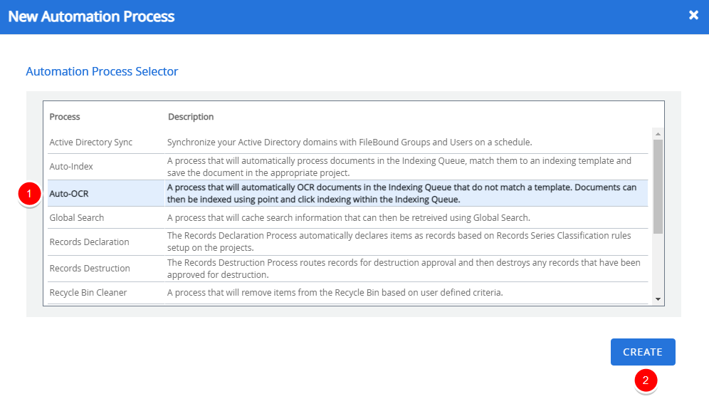 Process Type Description Active Directory Sync Synchronizes the groups and users from the active directory domains with the FileBound groups and users on a schedule. Auto-Index Automatically processes documents within the Indexing Queue. The documents are matched with an indexing template and then saved within the relevant project. Auto-OCR Automatically processes documents within the Indexing Queue that do not match a template. The documents can be indexed using the point and click indexing method later on. Global Search Creates a cache of search information that can be retrieved using global search. Records Declaration Used to find documents based on the specified criteria and declare them as records. Records Destruction Used to take action on the documents that are declared as records. Recycle Bin Cleaner Removes files and documents permanently from the recycle bin, based on automation parameters set. Renditions Creates document renditions of .pdf, .doc, .docx, .xls, and .xlsx document file types. Scheduled Report Runs automatically as scheduled and sends reports as email attachment in PDF or CSV format. Scheduled Workflow Routes the files or documents to a specified workflow process in a project. Workflow Summary Emails Sends summary emails to users that have active workflow assignments.
