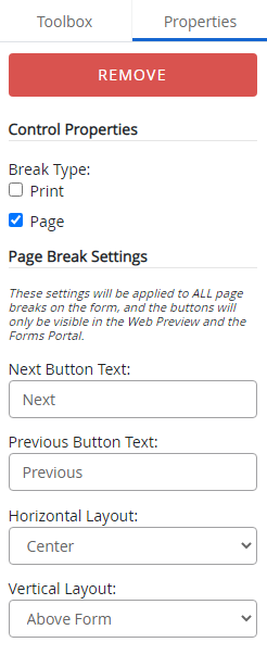 Once a break control has been added to a form, you can configure it using the options on the Properties tab.