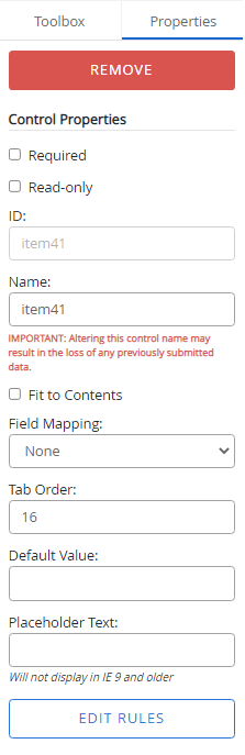 Edit Rules: Opens the Edit Rules window where you can configure conditional rules for the control. See Conditional rules for more information.