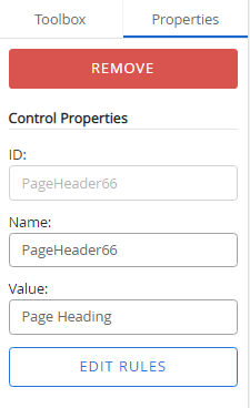 ID: The page heading ID. The ID is automatically assigned when a page heading control is added to a form. The value of this field cannot be edited.