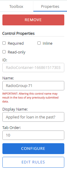 Configure: Opens the Edit Radio Button window where you can configure the radio button control.